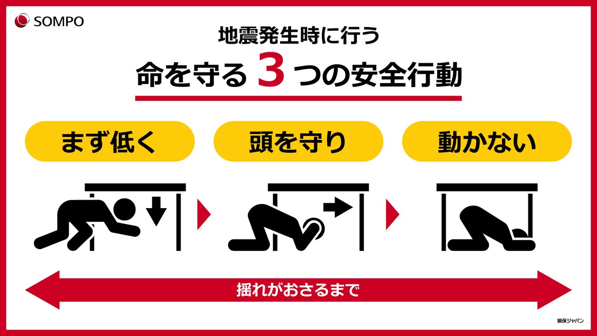 公式 損保ジャパン on X: "\3 ステップで命を守る!地震 発生時にとるべき安全行動💡 今日は防災の日 。いざというときに慌てないために、次の 3 つを覚えておきましょう! 1️⃣姿勢を低く 2️⃣頭をしっかり守る 3️⃣揺れが収まるまで動かない 命を守るための。