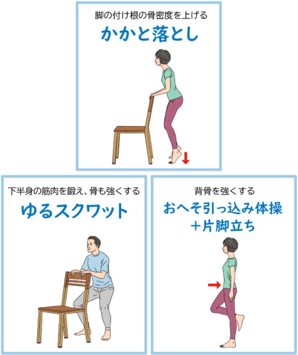 かかと落とし、おへそ引っ込み骨を強くする3つの運動:見ながらエクササイズ:日経Gooday グッデイ。