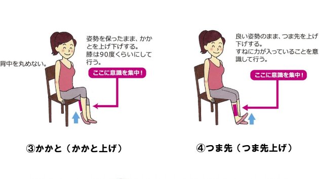 富久者有智 ふくはうちon X: "#貯筋運動座位プログラム③かかと かかと上げ姿勢を保ったまま かかとを上げ下げする脚は90度くらいにして ④つま先 つま先上げ良い姿勢のまま つま先を上げ下げする 脛に力が入っていることを意識 ※背中は丸めない。