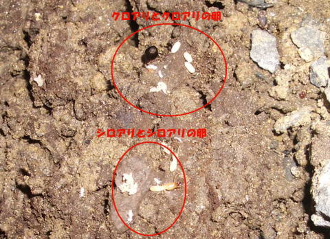 植木鉢をどかした下に蠢くアリたち: 昆虫ブログ むし探検広場。