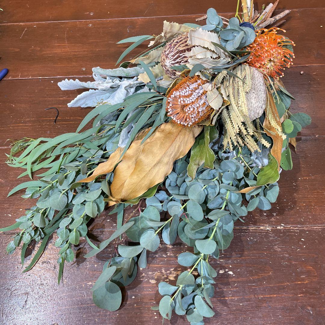 ユーカリたっぷりバンクシアのビッグスワッグ* シャビー&ナチュラルで人気♪ドライフラワー!簡単ユーカリスワッグの作り方週末に飾りたい花!花のある暮らしのレシピ集♪フランススタイルのフラワー教室ビアンカキャンディ~辻堂・藤沢・茅ヶ崎~。
