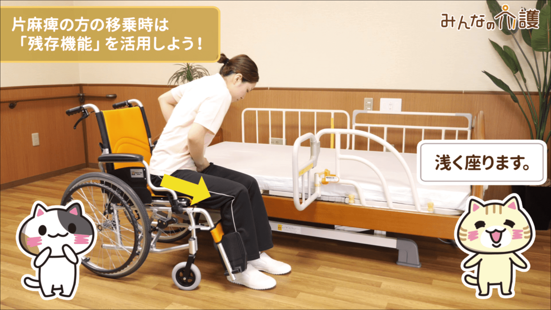 車椅子移乗を片麻痺の方が行うときは健側を軸にするみんジョブ。