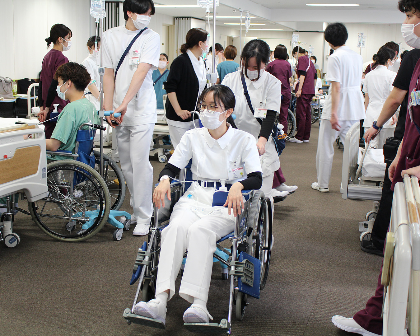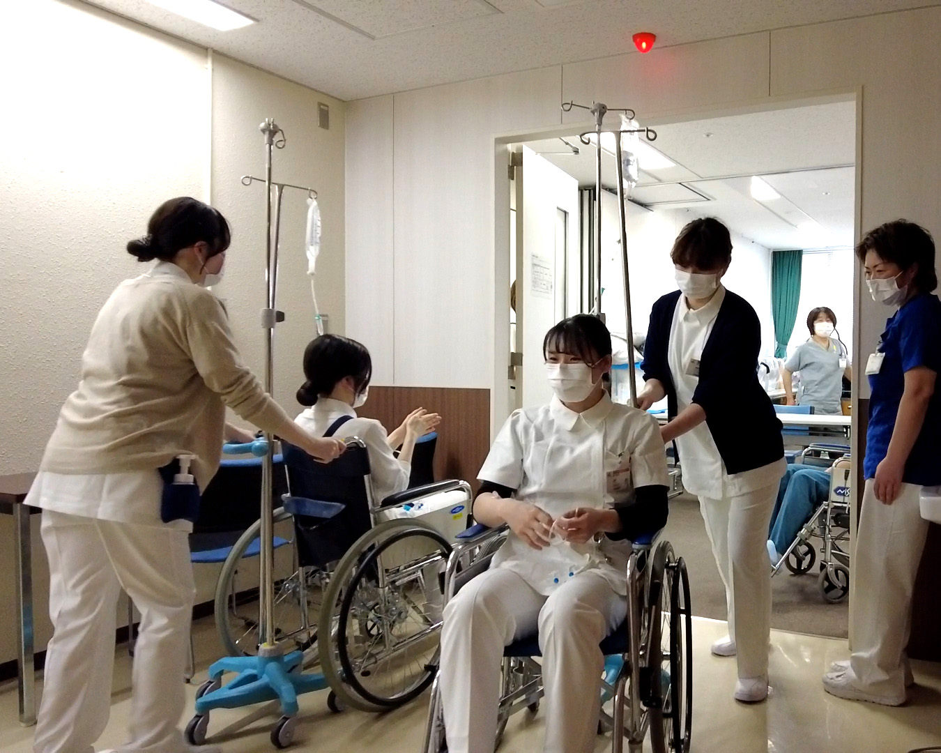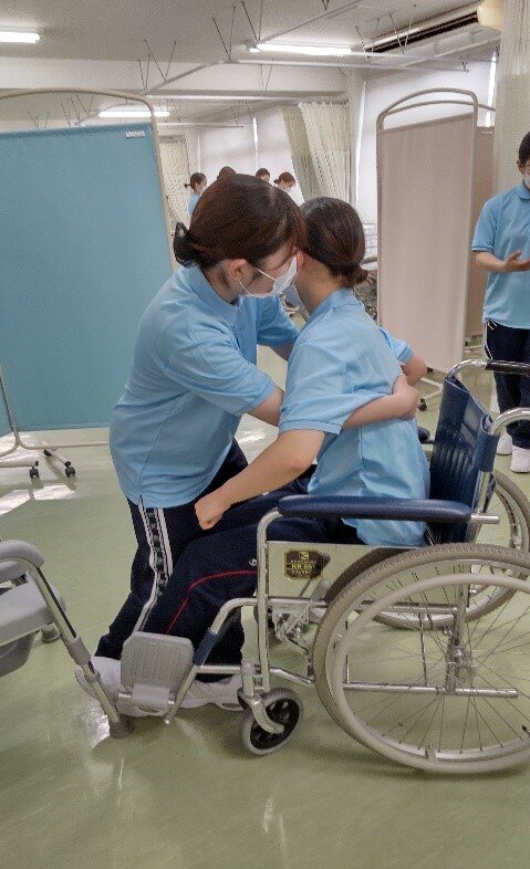 校内実習で車椅子・ストレッチャーの移乗・移送を行いました 1年生公立春日井小牧看護専門学校。