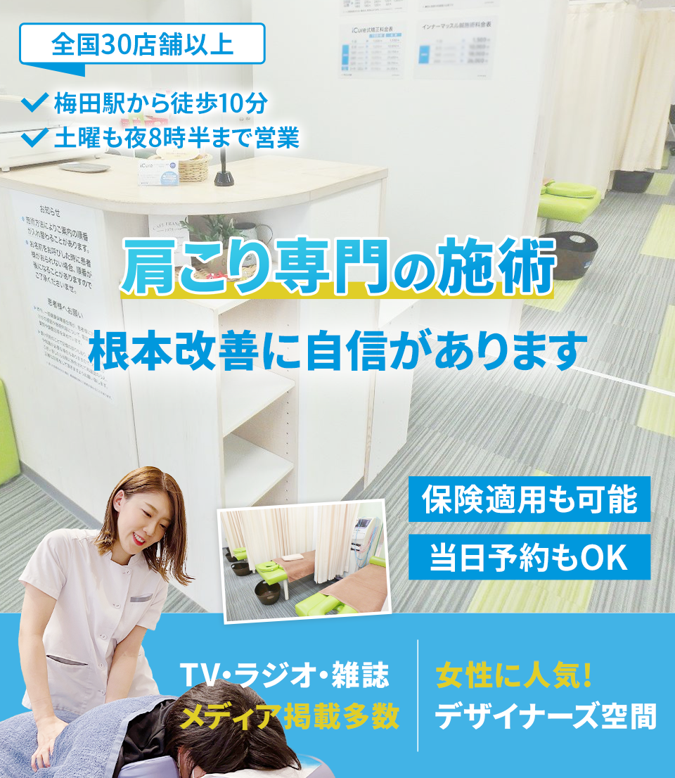 肩こり東梅田の整体 TVでも紹介 iCure鍼灸接骨院 東梅田。
