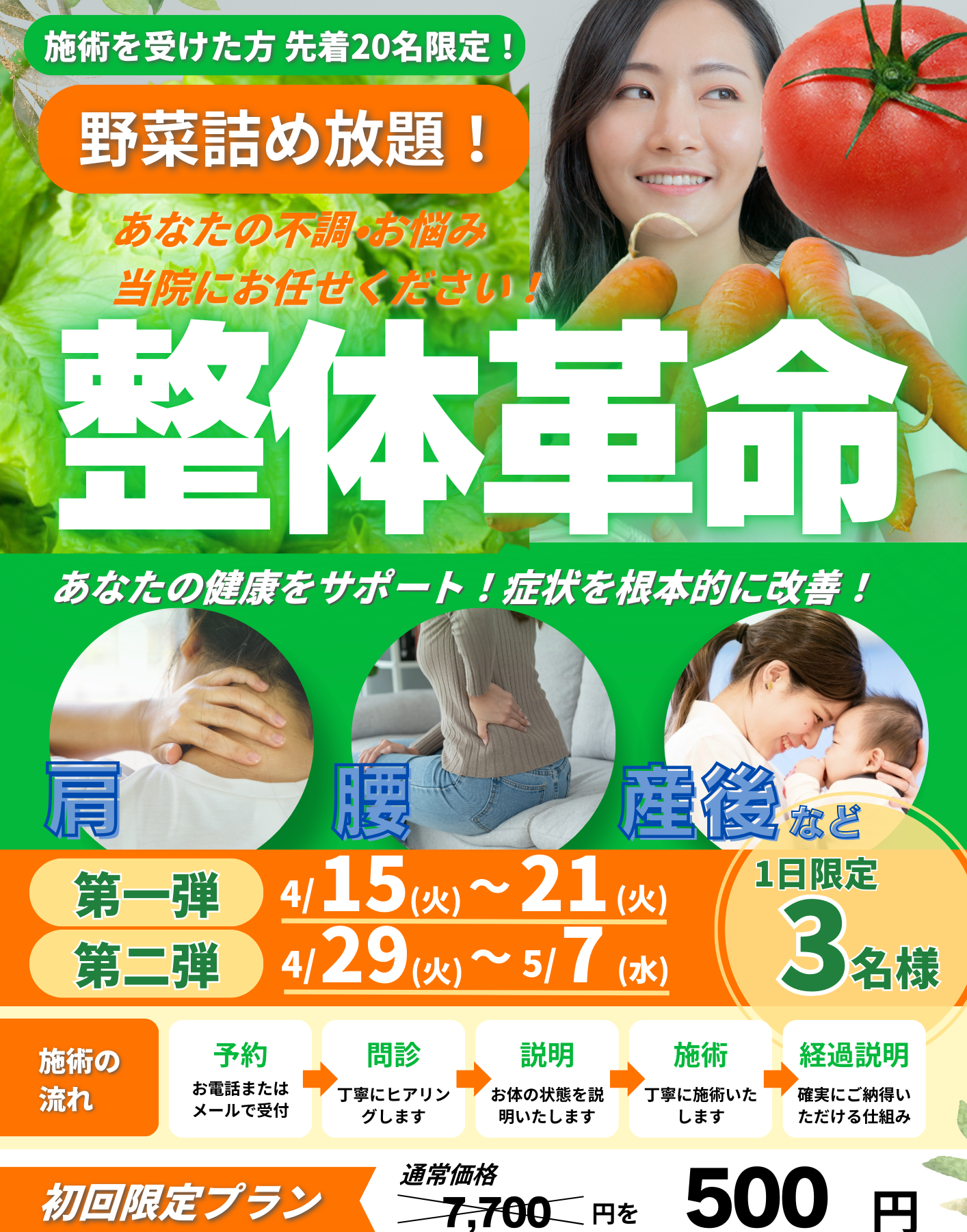 野菜がもらえる!施術も受けれる!第一弾4 15~21開催長崎のやわら鍼灸整骨院 整体院グループ。