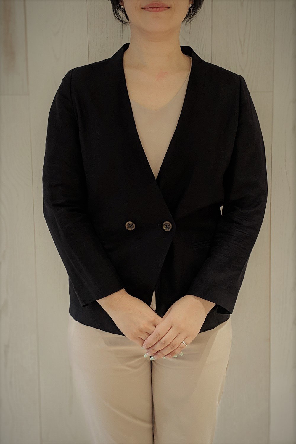 手を前に組んで立つ女性m014-068無料人物写真フリー素材の ビジトリーフォト 商用利用OK。