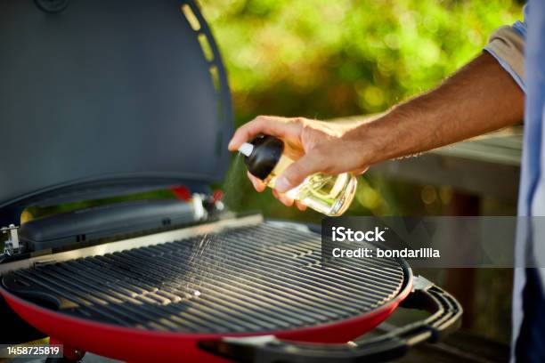 裏庭の屋外バーベキューガスグリルに油を吹き付ける男の手に近づいて - 吹きかけるのストックフォトや画像を多数ご用意 - 吹きかける, 食用油,バーベキューグリル - iStock。