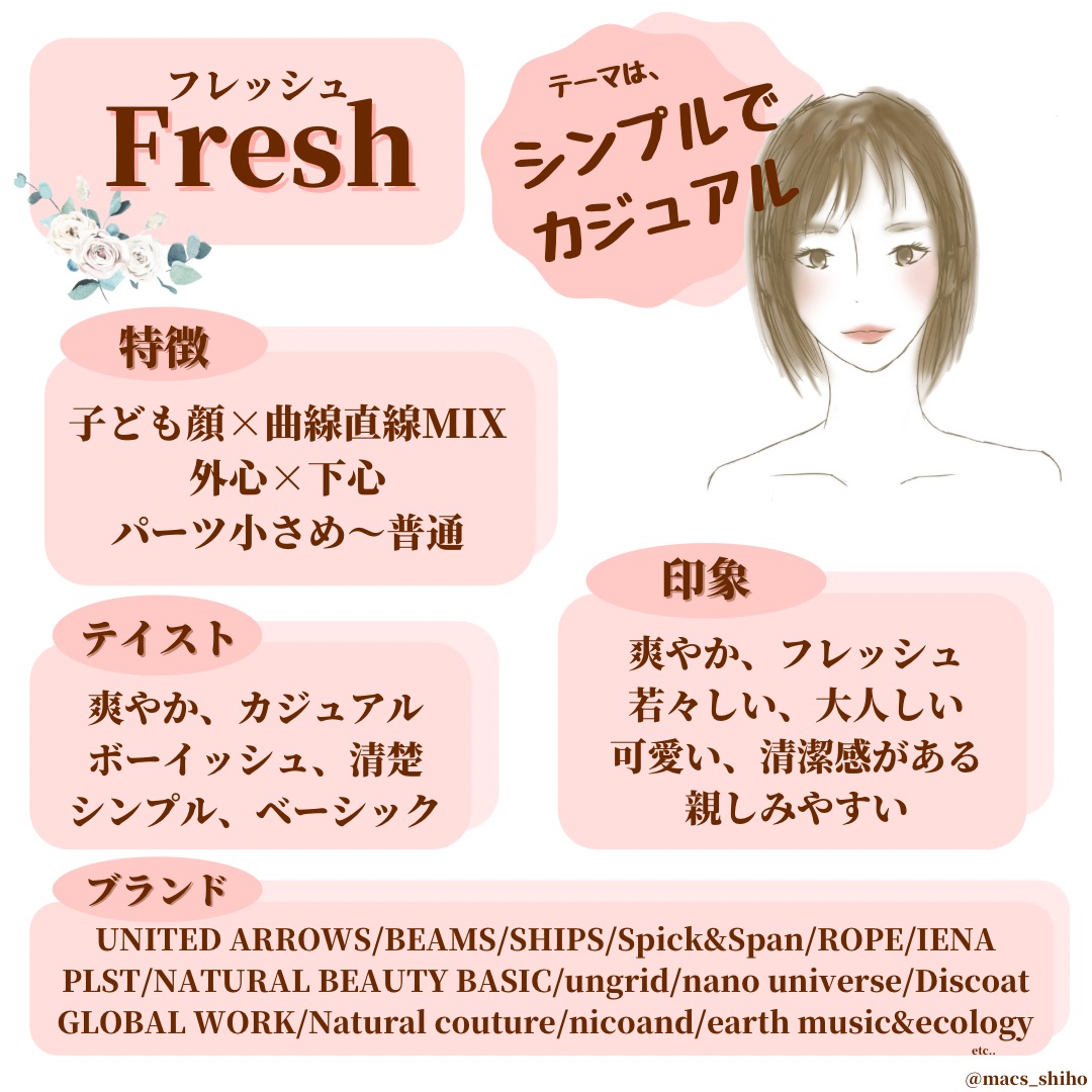 顔タイプ「フレッシュ」の特徴似合うファッション・メイク・髪型公式 日本顔タイプ診断協会。