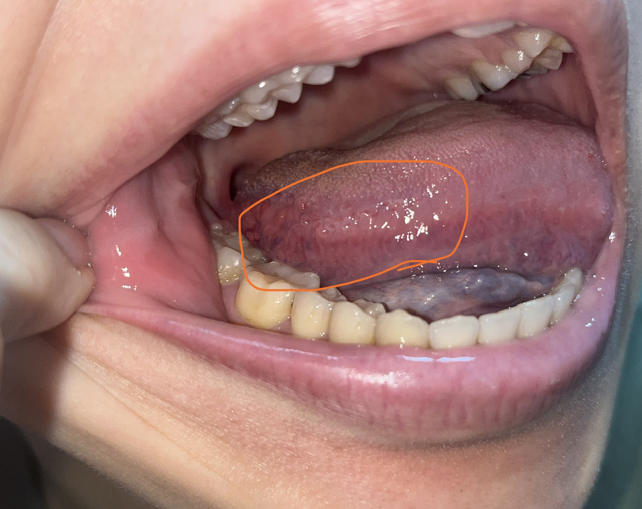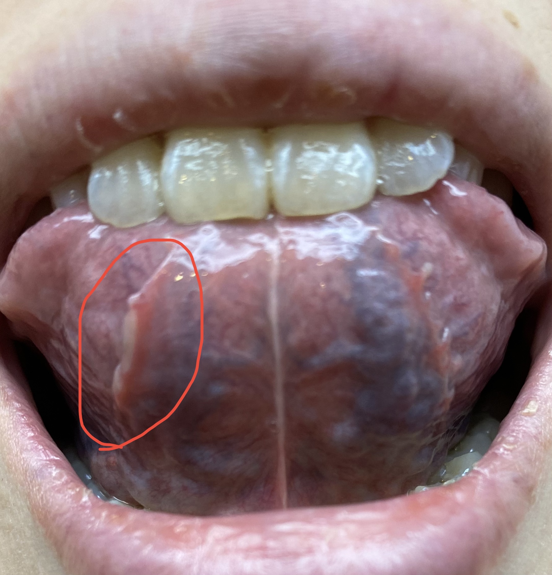 舌の右側側面、丸で囲った場所がよく痛みます。口腔外科.com-提供は安原歯科医院。