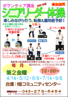 予約受付中 シニアリーダー体操 開催中!公式 千葉市花見川区畑コミュニティセンター 体育館・会議室・図書室。
