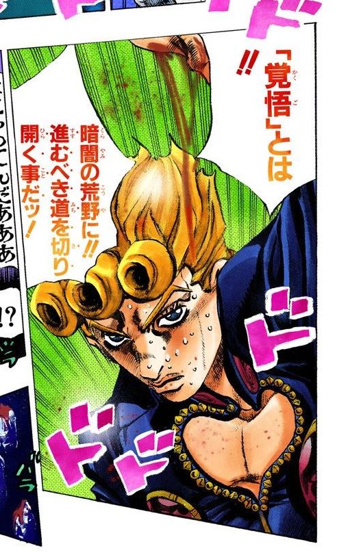 マンガの名言 「「覚悟」とは!!暗闇の荒野に!!進むべき道を切り開く事だッ!」@ジョルノ・ジョバーナ fromジョジョの奇妙な冒険 第5部9巻「ホワイト・アルバム⑥」より- ザ・マンガブログ。