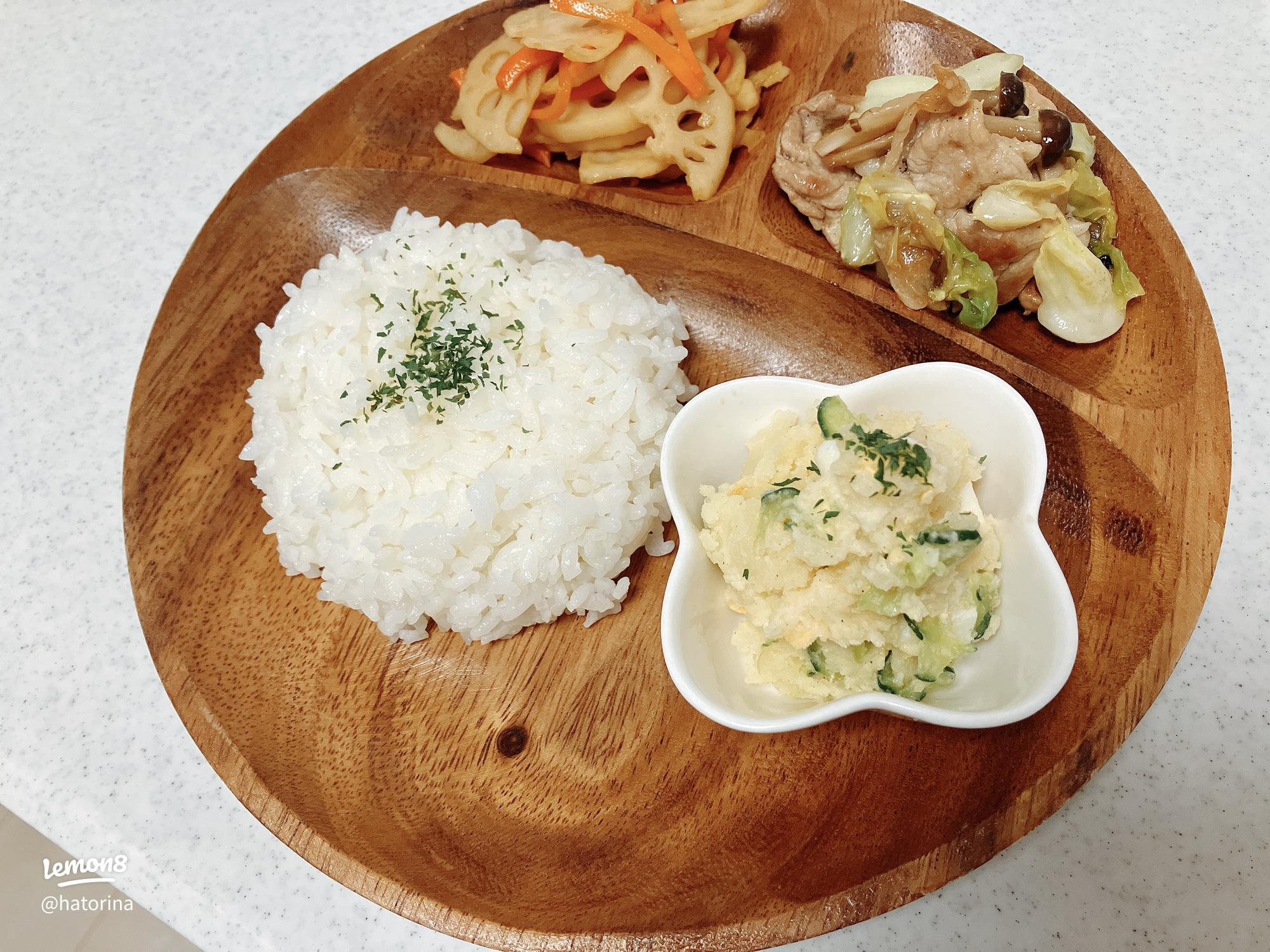 夜ごはんもちろん、ワンプレート😂 プレートというかもうワン椀😂 ブリ照りは子供たちと分けたので、 三分の一ほど。 ささみと大葉の炒め物、キュウリの塩揉み、 ブロッコリーの胡麻おかか和え。 春キャベツのお味噌汁も。 我が家は夜ご飯が18時ごろなので、 朝には。
