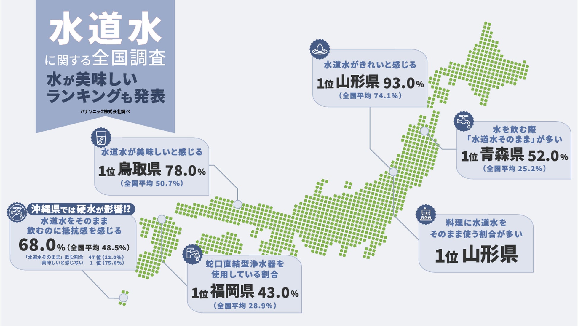 水道水に関する全国調査 水道水をそのまま飲んでいる人が最も多いのは青森県。水道水が美味しいランキングも発表。約半数が直接飲むのに抵抗を感じつつ、料理にはそのまま使用。パナソニック株式会社 コミュニケーションデザインセンターのプレスリリース。