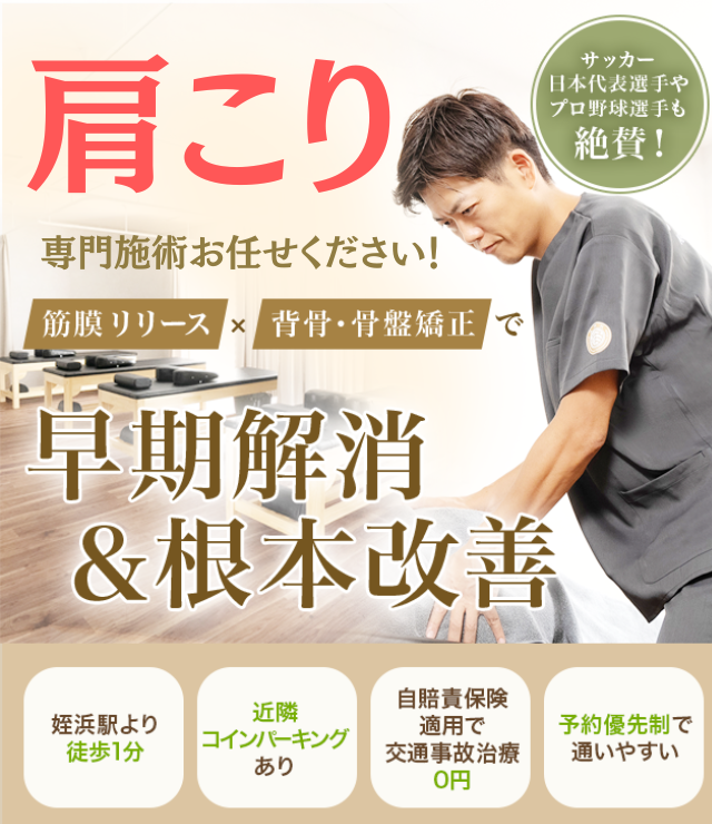 明石市で肩こりにお悩みなら根本改善の「にしやま整骨院・針灸院 整体院」。