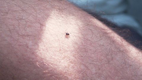 小さな虫の寄生ダニは、人の脚に這う。皮膚の接写をチェックします。ダニは脳炎の病気を持つ。人の肌に毛を通して生える吸血ダニ」の動画素材 ロイヤリティフリー 1073581532Shutterstock。