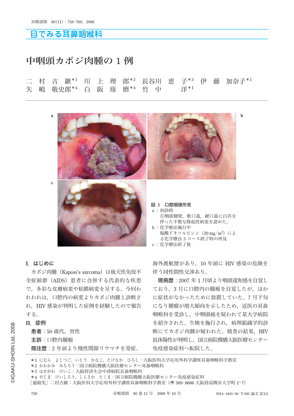 中咽頭カポジ肉腫の1例耳鼻咽喉科・頭頸部外科 80巻11号医書.jp。