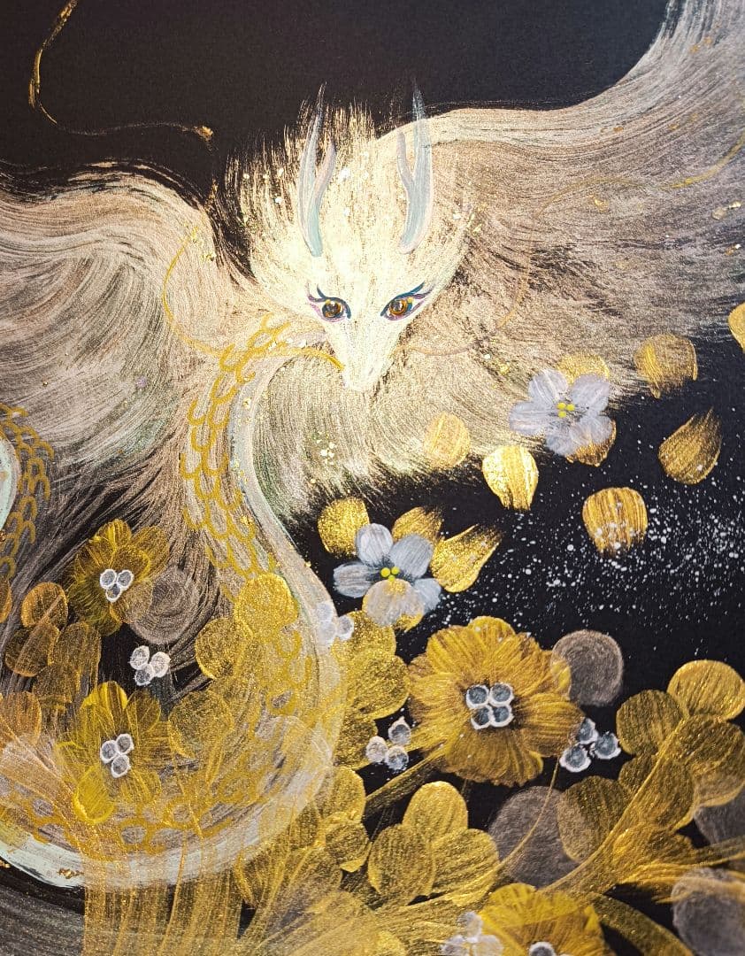 龍神様 白龍様 ❱です✨ 1日1龍チャレンジ幸福な白龍。 凛とした、神々しいような 白龍。 足元の花は、牡丹。金沢の金箔は、上品な輝きを纏ってくれるので、大好きです。1日1龍チャレンジ⠀龍龍神画龍神様龍神 ⠀スピリチュアル龍の絵金運開運。