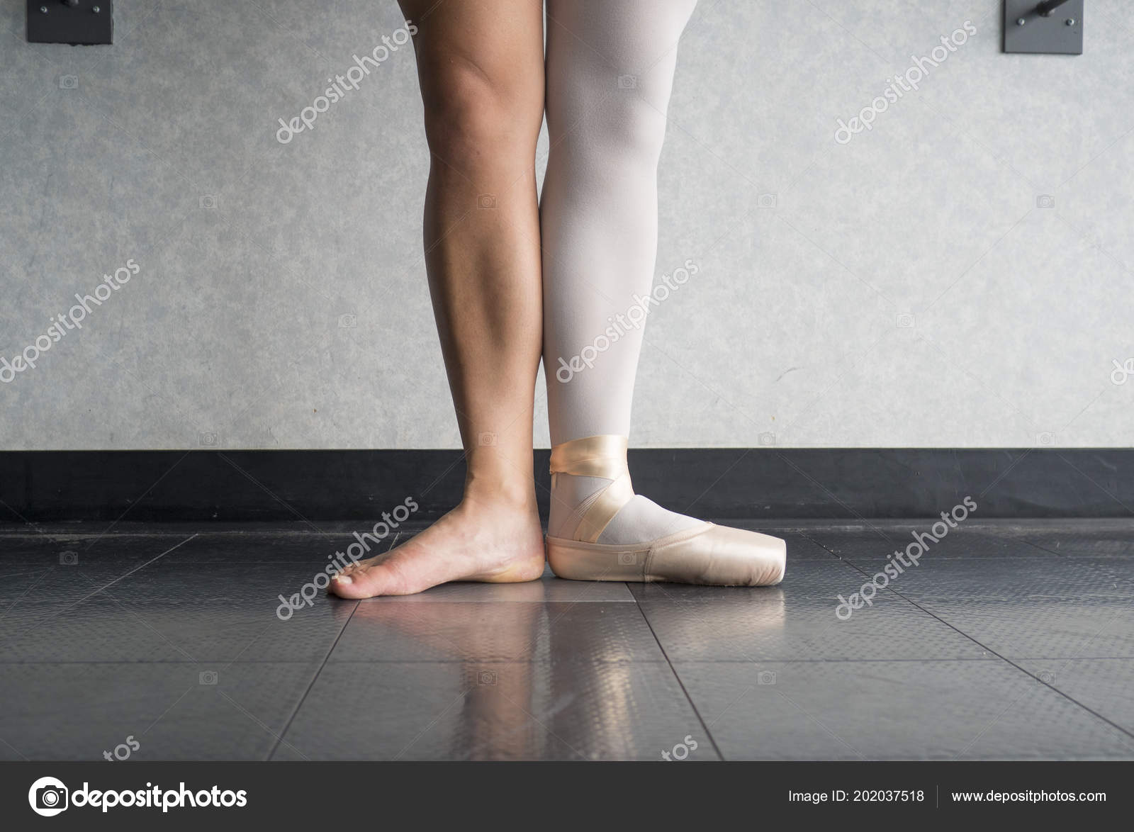 バレリーナの両側 1本の足にバレエスリッパの尖った靴を履いた片方の脚 片方の脚が裸 — ストック写真 © kbycphotography202037518。