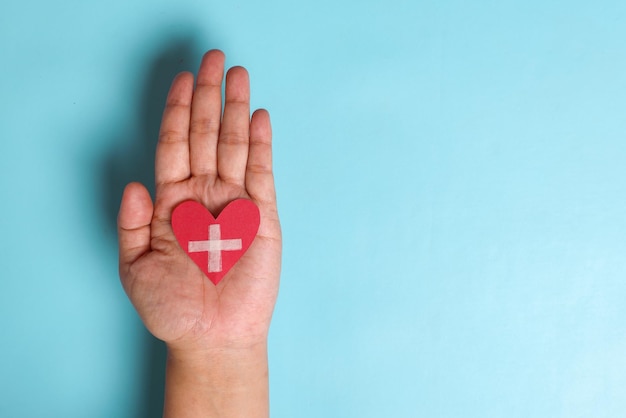 赤十字を持った手はハート形の献血、輸血、世界献血に署名しますPremium写真。