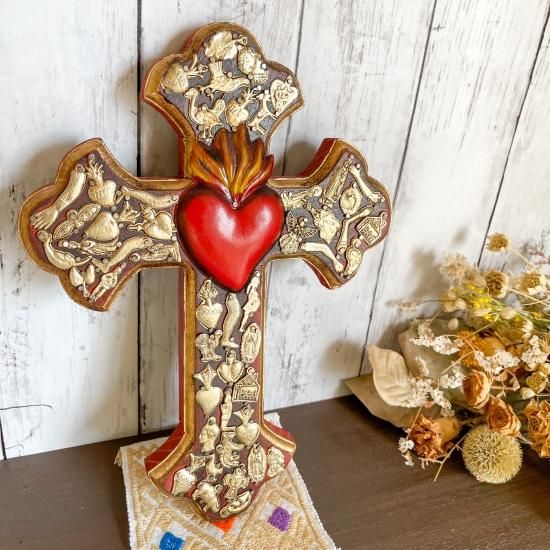 メキシコ産 ミラグロクロスオーナメント コラソン赤十字架 クルス ハート 壁飾り 壁掛け。