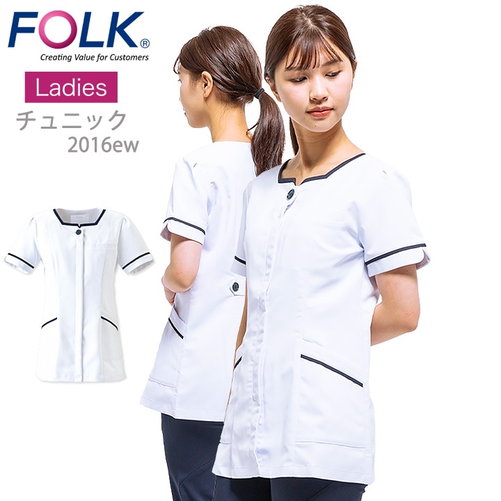フォーク スクラブ チュニック 医療用 白衣 レディーススクラブ 女性用 FOLK 2014cr ユニフォーム 医師 医療用 看護師 クリニック診療衣 白スクラブ 動きやすい ホワイト 前開き ジップタイプ│作業服・作業着の通販サイト│だるま商店 公式。
