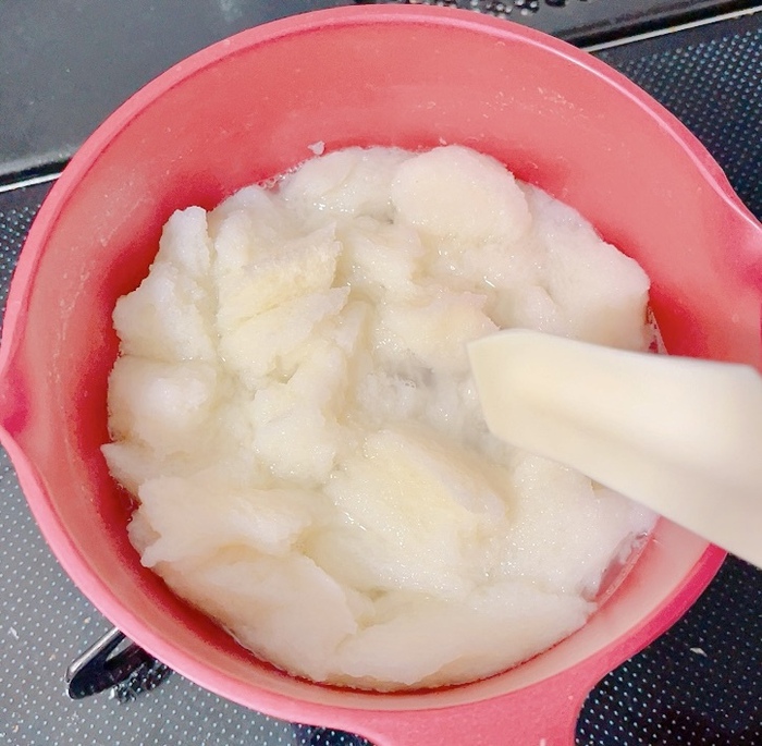 パンがゆ”レシピあり ①冷凍食パン8枚切り 1 2 を おろし金ですりおろす ②鍋に入れ野菜スープを加えて 中火で沸騰するまで火にかける③沸騰したら弱火にして 焦がさないように とろみがつくまで混ぜる ※量が少ないので 焦げないように気をつけましょう 𓂃𓈒𓏸 𓂃。