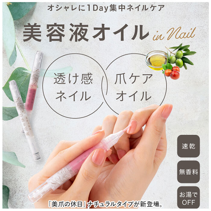 爪 美容液 通販 美爪の休日 ナチュラル ネイル美容液 美容液オイル ネイルケア オイル 補修 ネイル ケア マニキュア マニュキュア お湯でオフ筆ペンタイプ ノック式 速乾 無香料 日本製 コスメ 潤い 保湿 保護 艶 ツヤ 透け感ネイル 清潔感 おしゃれ即日発送 美容液。