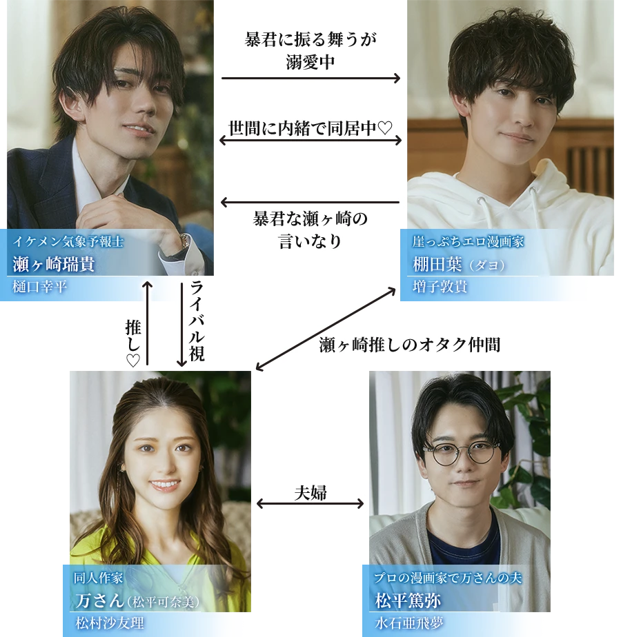 ドラマ体感予報」 ☂キャストコメント☀ ﹏﹏﹏﹏﹏﹏﹏﹏﹏ 瀬ヶ崎瑞貴役樋口幸平 気象情報チャンネル「エブリデイウェザー」の人気イケメン気象予報士。売れないエロ漫画家・棚田葉の衣食住を保証するかわりに、すべての家事を任せて同居中。 恋心をこじらせた。