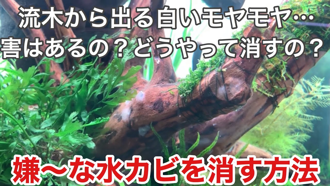 水草水槽の流木ら出る白いモヤモヤ 水カビ を消す方法〜発生の原因とその対処、解決策を解説します!How to remove white funguson driftwood in aquarium。