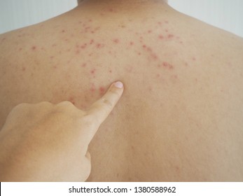 人が指で背中を指さし、発疹を熱し、日差しや暑い日や汗で屋外の仕事が原因で皮膚がチクチクする熱。を使用して医療のコンセプトを説明します。写真素材1380588962Shutterstock。