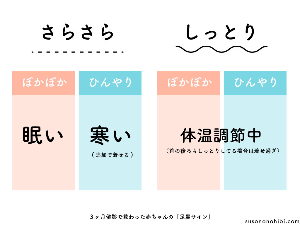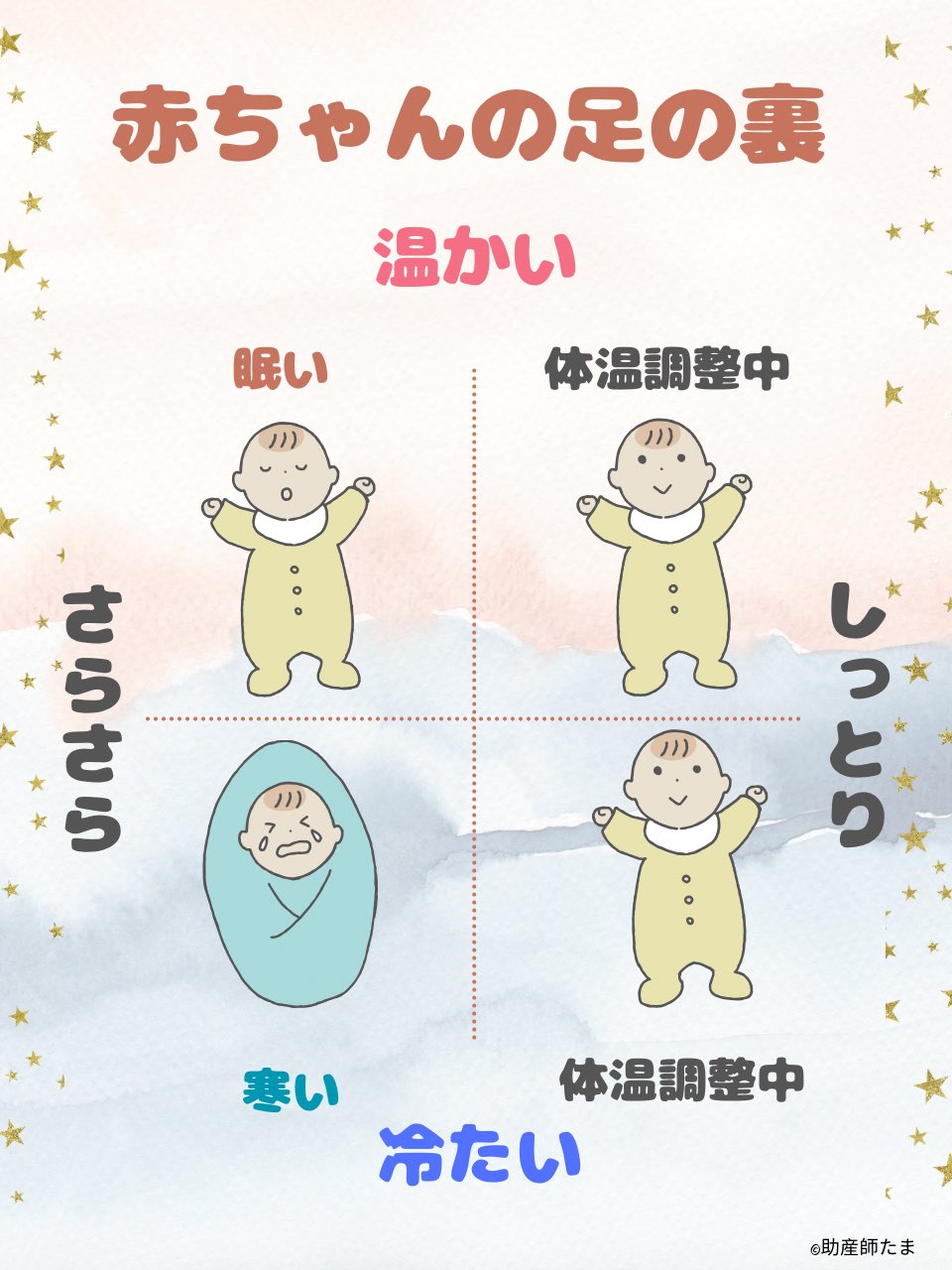 助産師たま🌟 on X: "まだまだ寒いので赤ちゃんの足の裏で体温のチェック☃️ ☆サラサラ×温かい→ねむい🥱 ☆サラサラ×冷たい→さむい🥶☆しっとり×温かい→体温調整中 お腹や背中が汗ばんでいたら1枚脱がせる ☆しっとり×冷たい→体温調整中 そのままでOK! https。