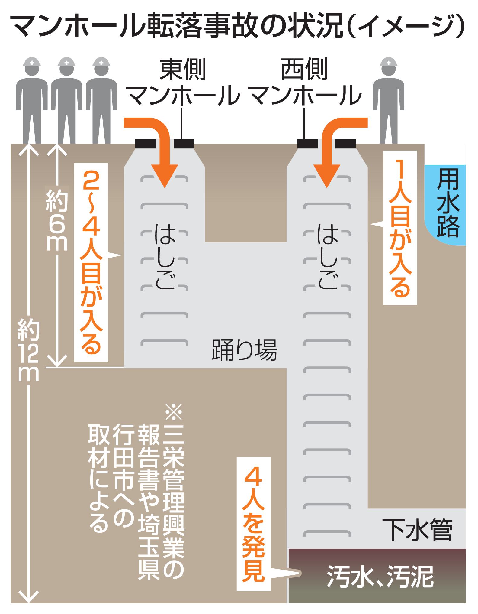行田のマンホール転落死亡事故、はしごで下りていた1人が意識失い落下 助けようとした3人も。