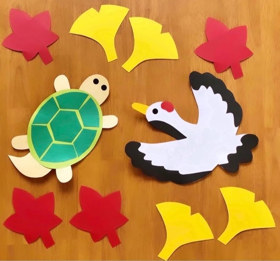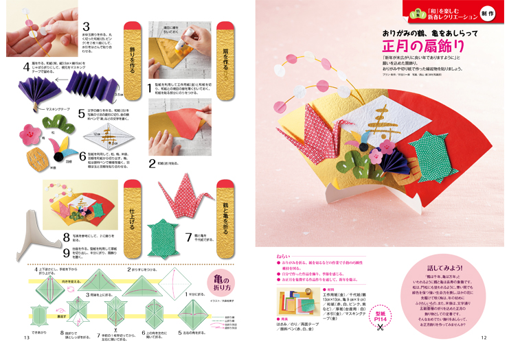 鶴・亀をあしらって 正月の扇飾り高齢者介護をサポートするレクリエーション情報誌『レクリエ』。