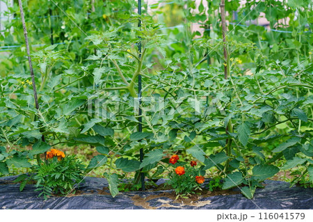 無農薬農家のビニールハウスで育つトマトと天然の防虫効果のあるバジルやマリーゴールド。の写真素材75975509- PIXTA。
