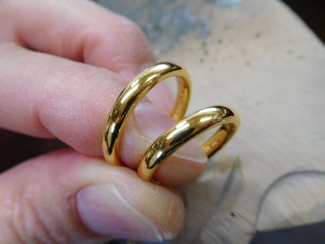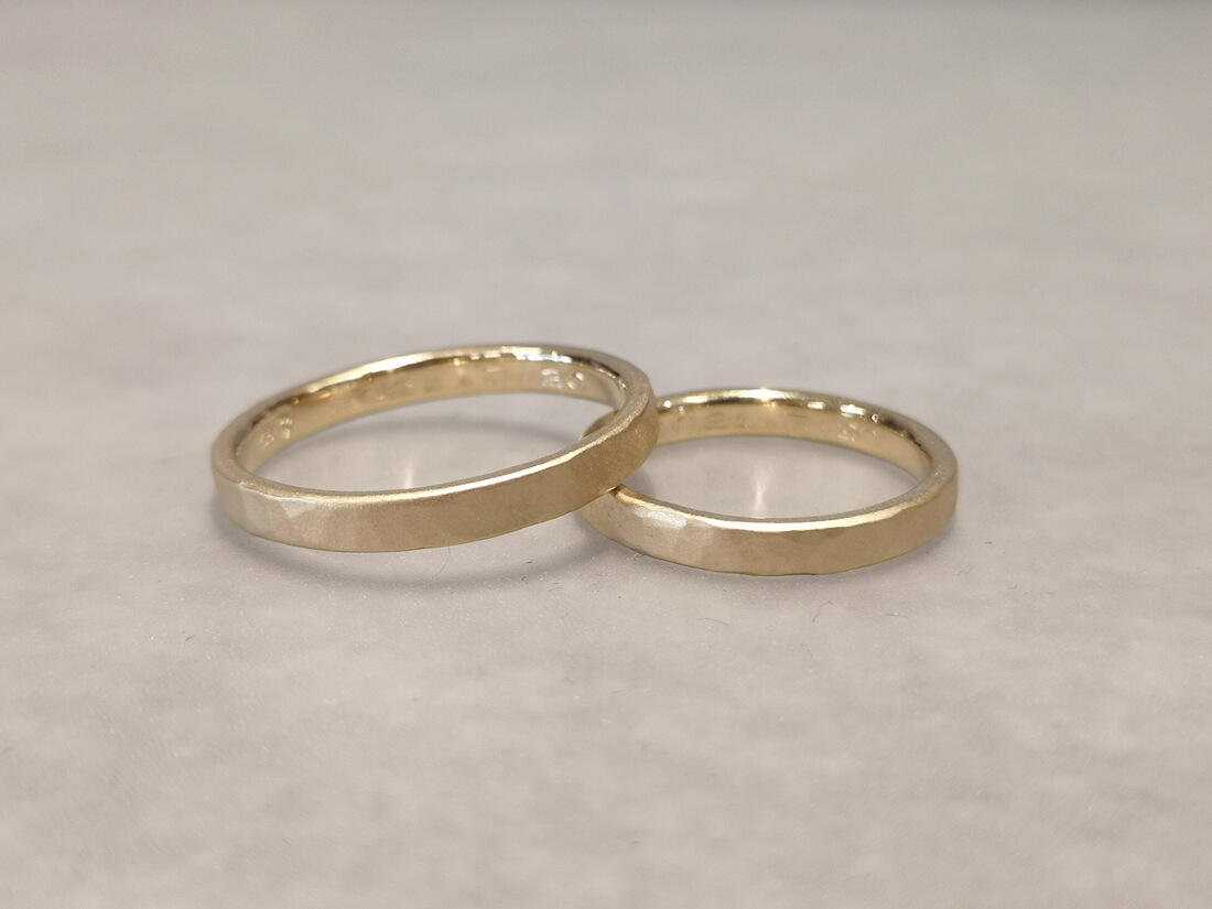 K18イエローゴールド・つや消し槌目の手作り結婚指輪手作り制作事例。