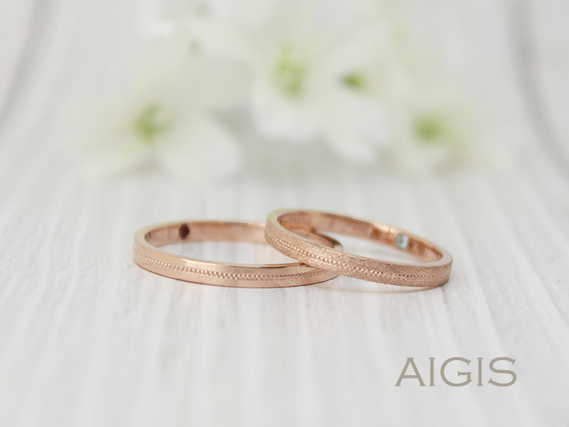 マット つや消し 加工を施したピンクゴールドの結婚指輪鶴mikoto。