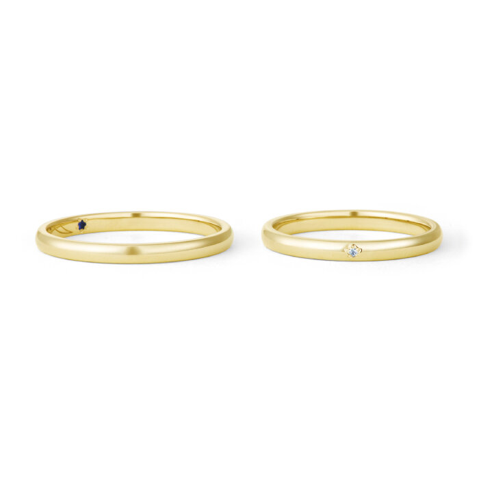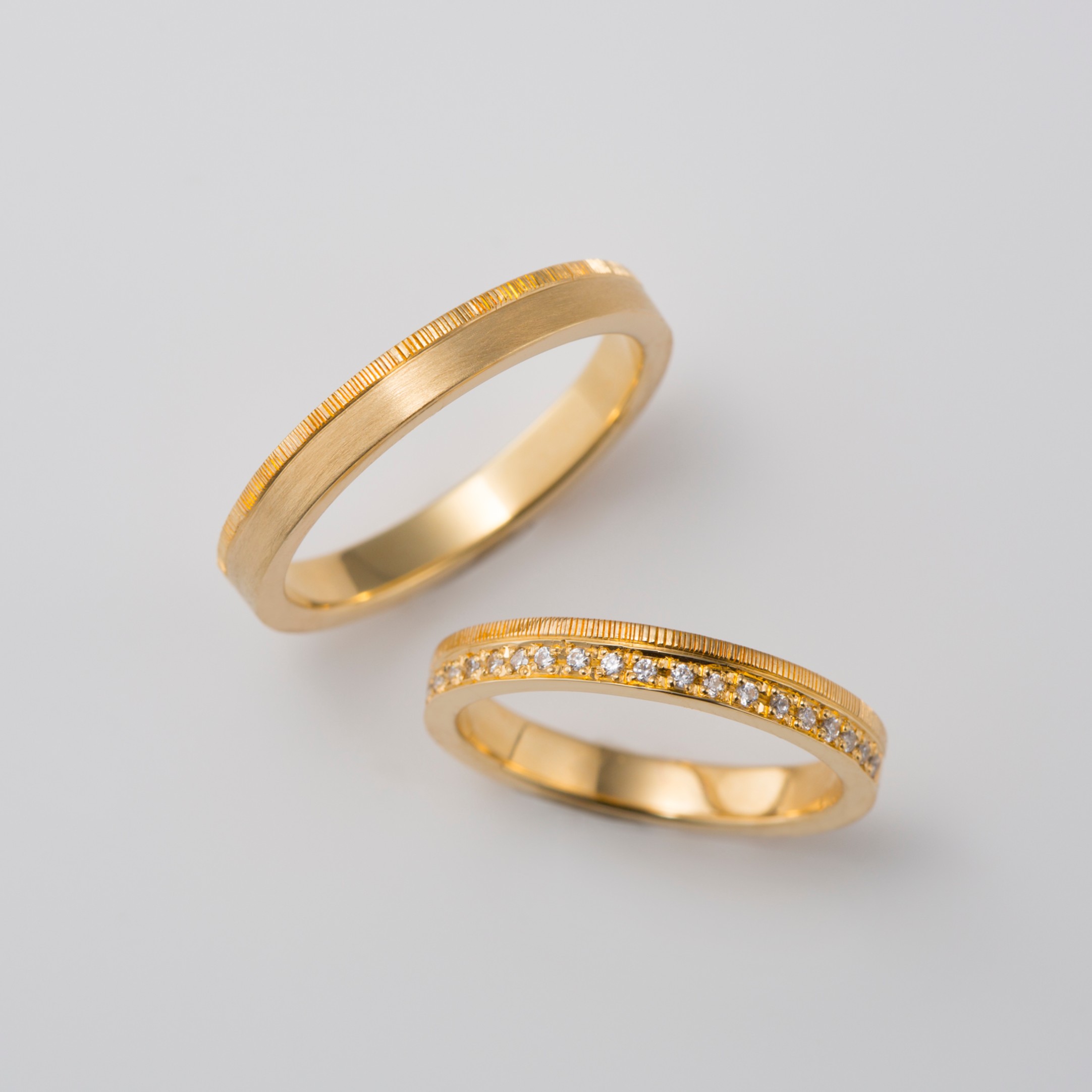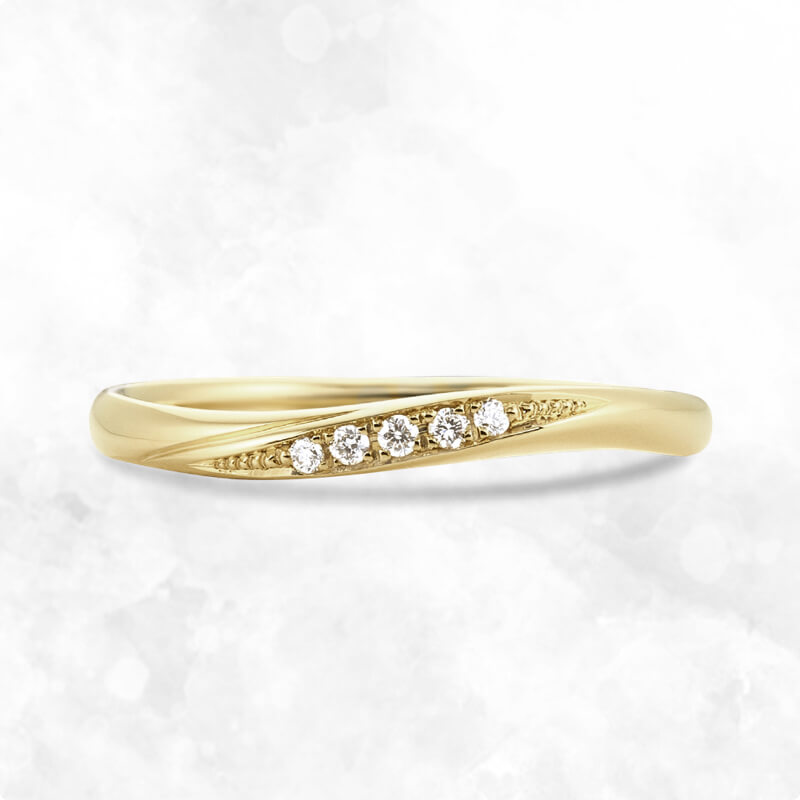 ダイヤモンドをあしらったつや消しゴールドの結婚指輪鶴mikoto。