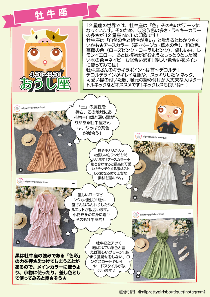 ワンピース・ドレス多め 牡牛座女子のファッション&ラッキーカラーのお話☆チコチェルシィ占い。