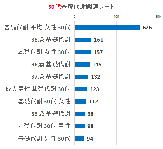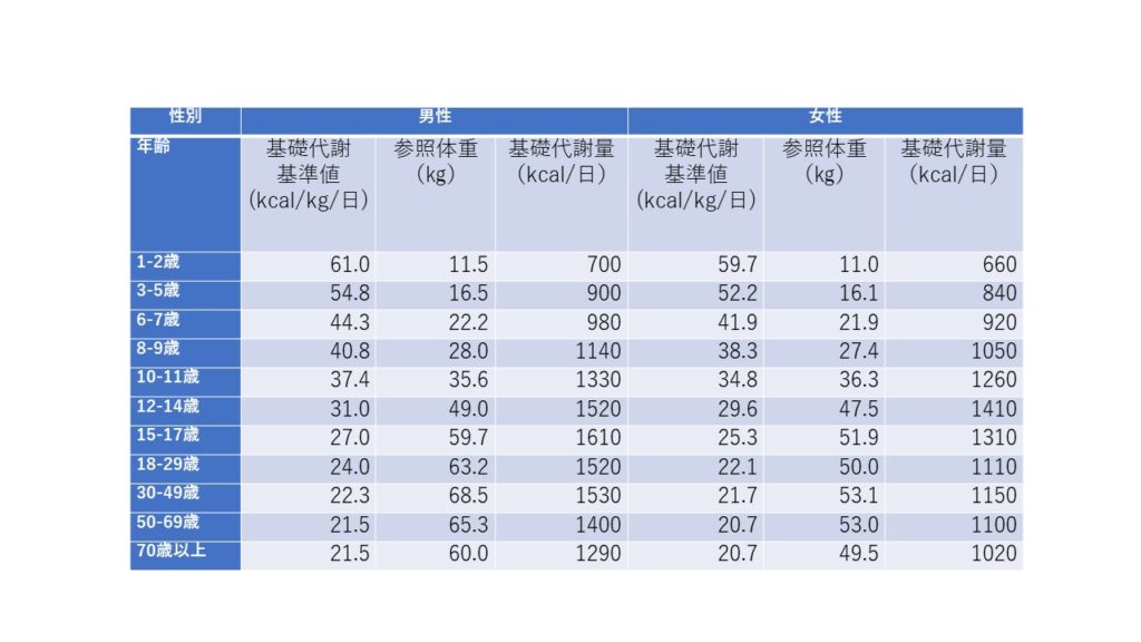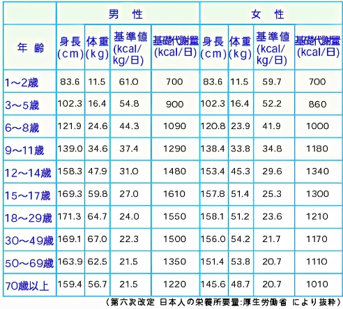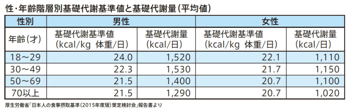基礎代謝量早見表 年齢別20代・30代・40代・50代・60代の男女。