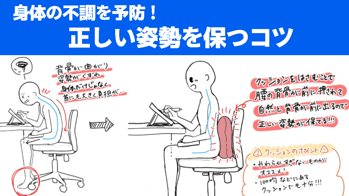 絵・イラストを描くとき、正しい姿勢で椅子に座るコツ。腰痛対策に!お絵かき図鑑。