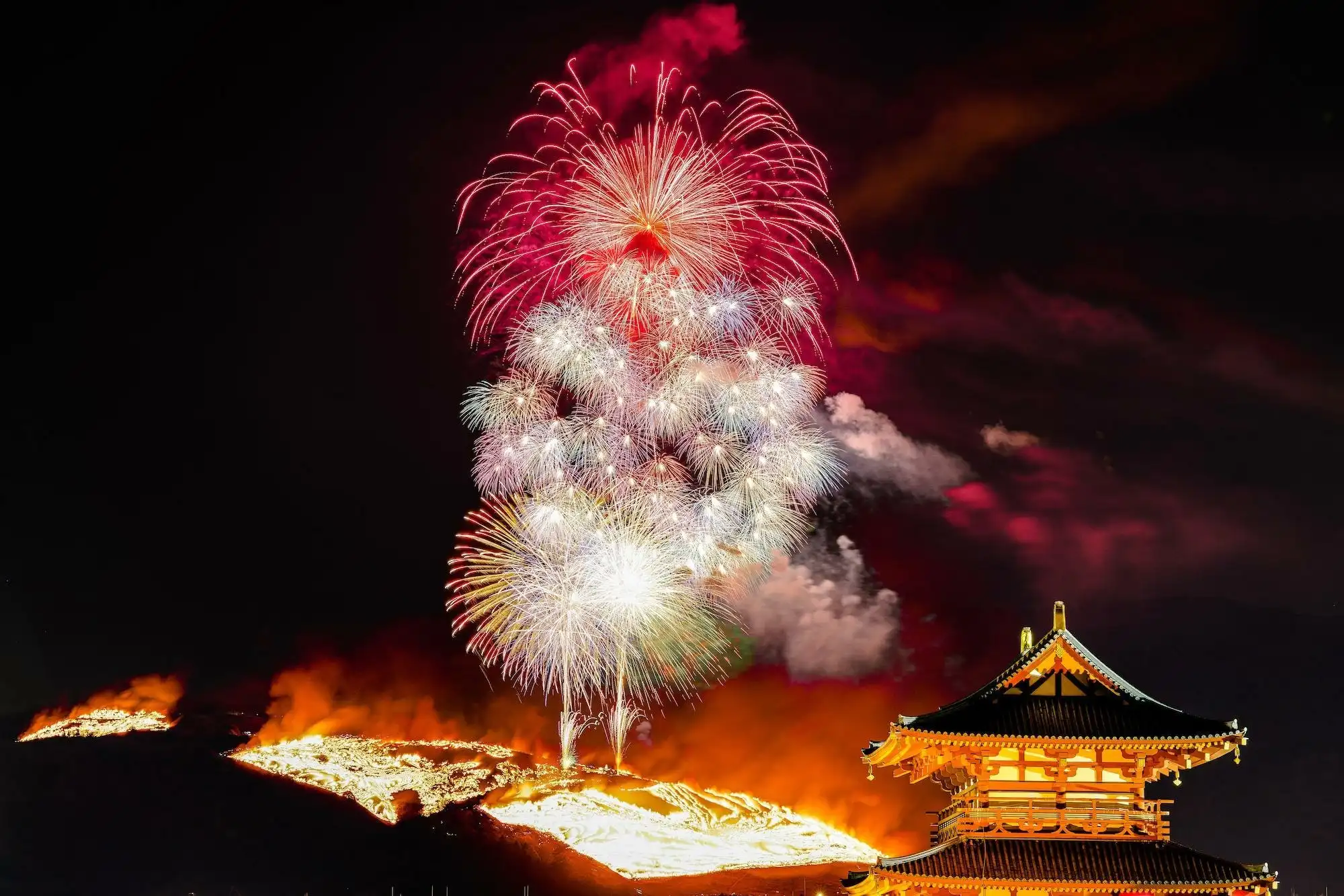 冬の風物詩・奈良の伝統行事『若草山焼き』:『Yamayaki』Mountain Burning and Fireworks atMt.Wakakusa in Nara。