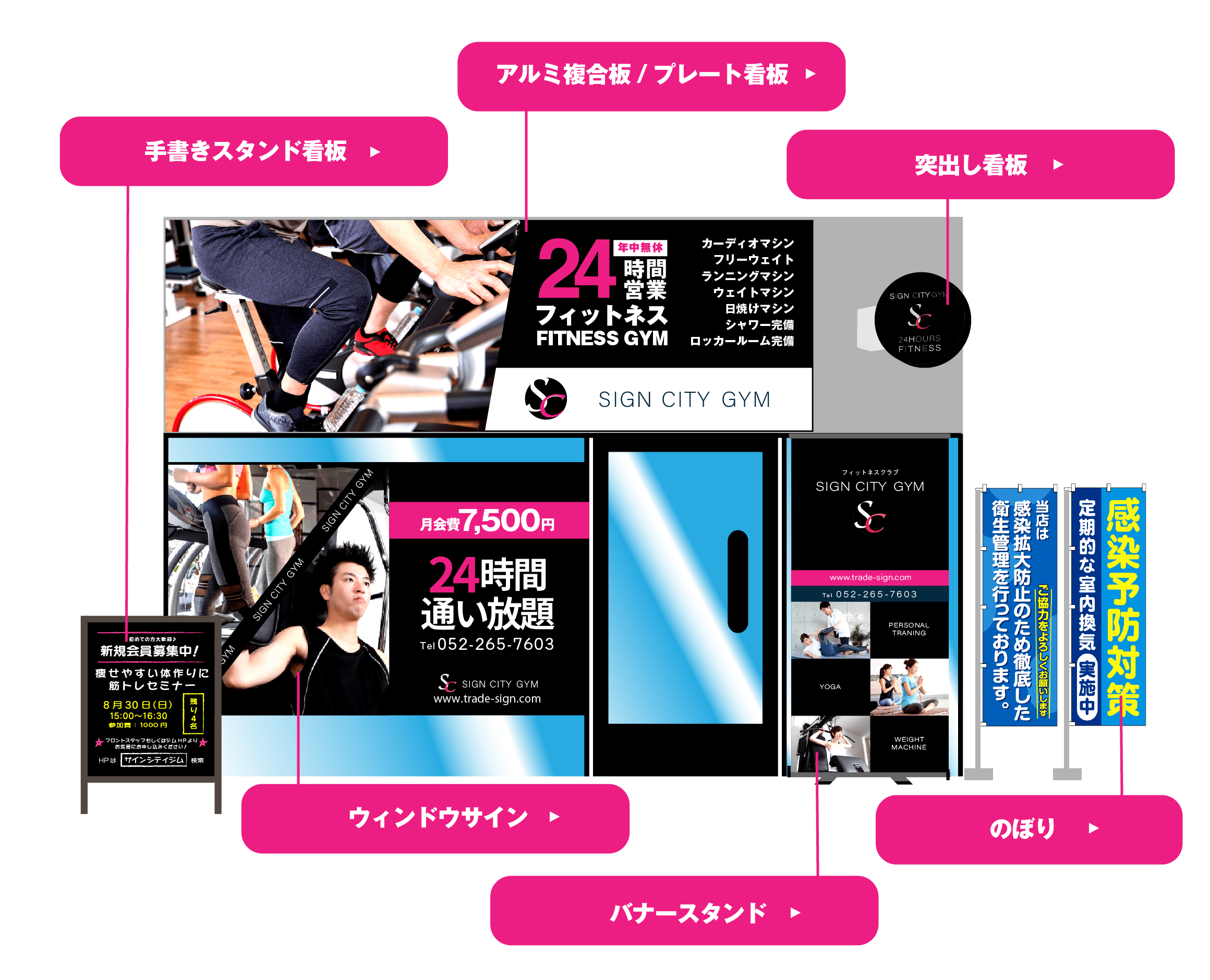 フィットネス・スポーツジムで必須な看板激安通販看板の激安通販サインシティ 看板設置も全国ご対応!。