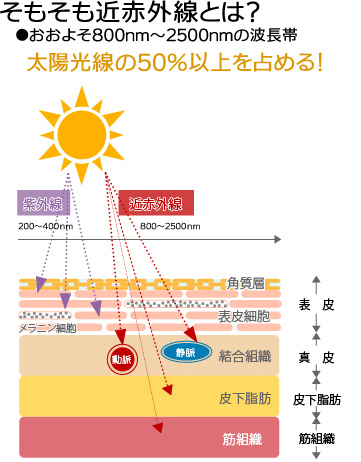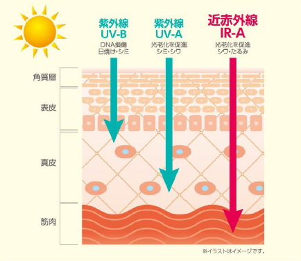 太陽光線は、紫外線 UV 、可視光線、赤外線IR の3つに分かれます。このうち、光老化に最も大きな影響を与えているのが紫外線です。また、可視光線の一部であるブルーライトや近赤外線 NIR も光老化に関係しています。光老化啓発プロジェクト。
