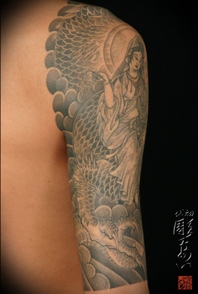 刺青 騎龍観音 腕 九分刺青 東京 福生、八王子、立川、吉祥寺、新宿 なら刺青師龍一郎。