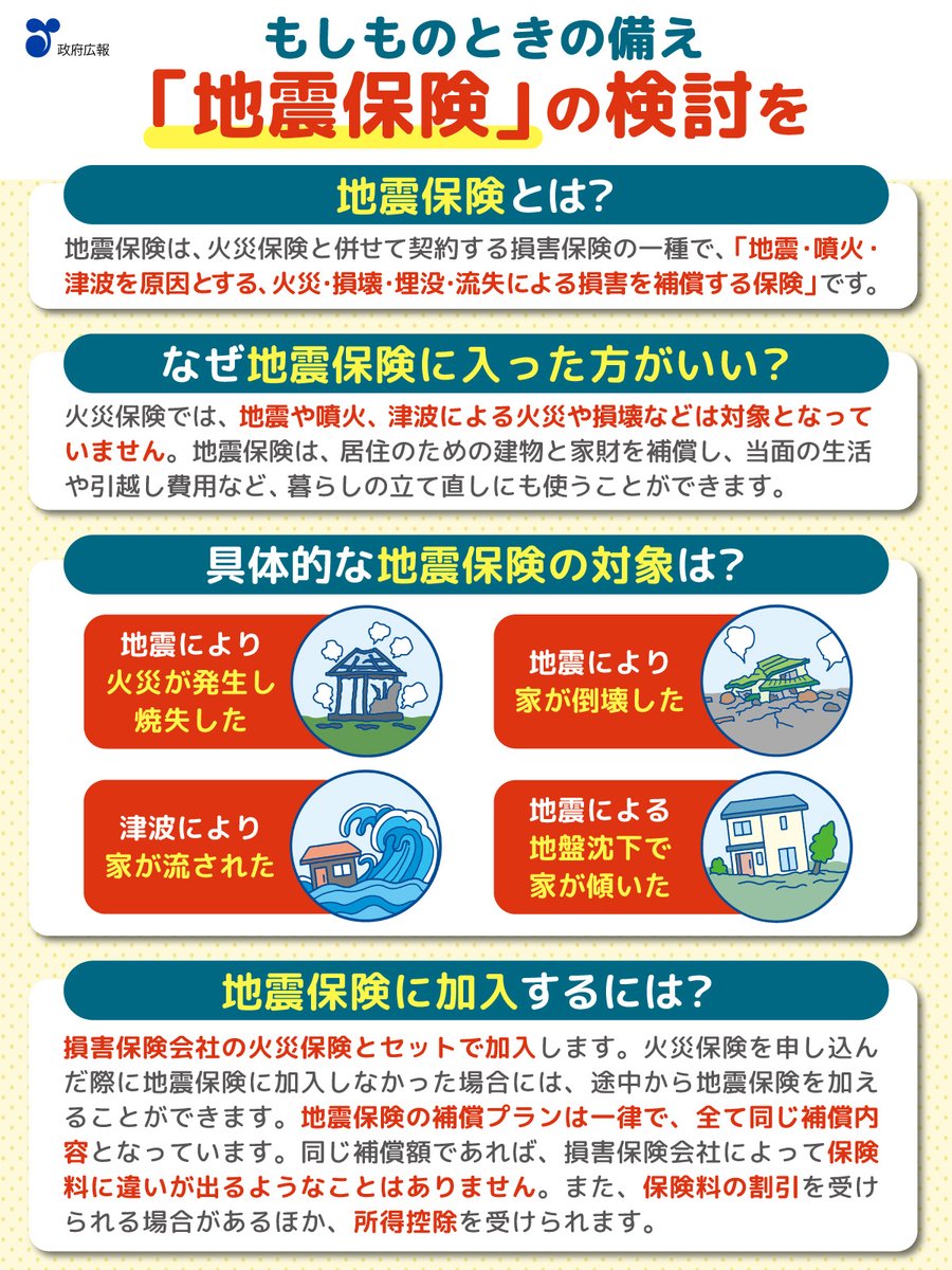 政府広報オンライン on X: "📢地震保険に加入していますか? 地震保険は、地震による直接的な住宅の損壊、火災、津波 などで住宅や家財が受けた被害を補償する、「官民共同の保険」です。 もしものときの備えに、「地震保険」の加入を検討してみませんか。https:t.co。