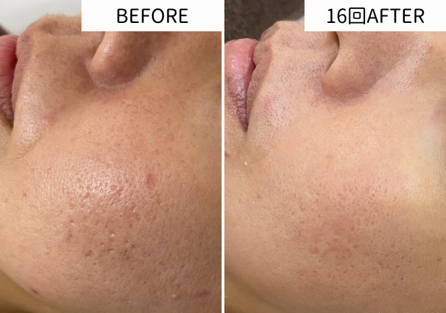 4年お通い下さっているお客様です。 はじめてご来店された時は、大きくボコボコとニキビが繰り返しできては、色素沈着の痕に。 アイスピック状のクレーターもたくさんありました。 ご自身でも色々試して努力してみましたが、治らず 『もうプロへ頼もう』 と。