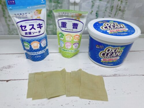 しまっておいた服の黄ばみを落とす方法!有効なのは重曹かオキシクリーンか?つけ置き時間は?実際に検証してみたハナの洗濯ラボノート。