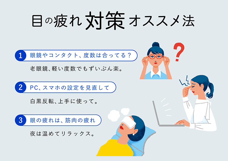 今すぐできる 目の疲れを取る方法4つ。原因に合わせた対策&予防をしよう。