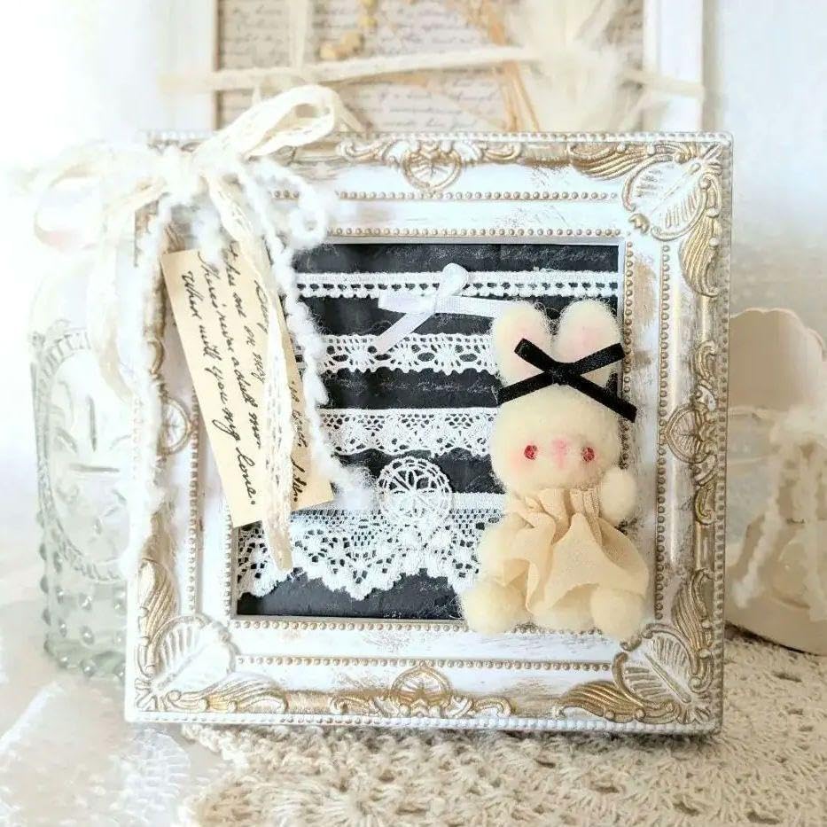 アンティークレース見本風フレームアレンジ立ち耳ウサギ羊毛フェルト 3Dマスク ピンク 60枚。
