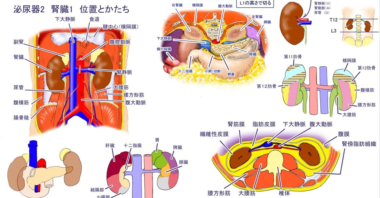 腎臓の位置腎臓は左右に1つずつ T11〜L3上縁の間 「右腎は左腎より少し低い」が大切 これは右側に大きな肝臓があるから理由付けによる記憶の強化腎臓は腹膜後器官も重要! 腹膜後器官・十二指腸、膵臓、腎臓、副腎 ひとかたまりにして、まとめて覚えるのが。